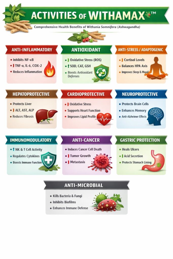 Withamax™ is made from a very special extract that enriches only the desired active ingredients to a very high level at the same time eliminating the inactive and potentially hazardous active chemicals. The active ingredients are unique adaptogens in the sense that they have scientifically proven multiple actions through several mechanisms affecting almost all the systems in the body. The main activities are anti-inflammatory, antimicrobial, antioxidant, anti-stress, immunomodulatory, hemopoietic, hepato-protective, neuro-protective, cardioprotective, rejuvenate, chemoprotective, chemo-potentiation and anticancer properties.Additionally, it has been proven to enhance the effectiveness of the anti-cancer therapies like chemotherapy and radiotherapy. They also have proven anticancer properties reported in cellular and animal models.